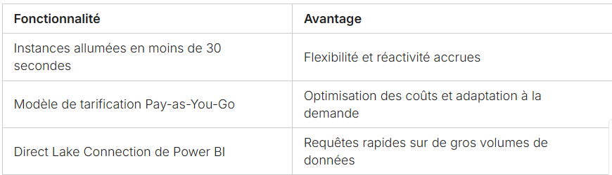 Microsoft Fabric offre des performances exceptionnelles pour optimiser les coûts. Les instances s'allument en moins de 30 secondes. Elles peuvent être éteintes et rallumées presque instantanément. Cela permet une gestion efficace des ressources (6).