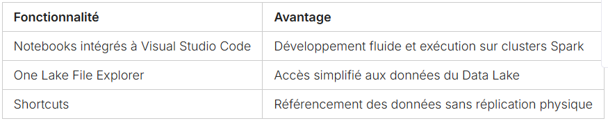 Fabric offre des notebooks pour Visual Studio Code. Il a aussi un One Lake File Explorer et des Shortcuts pour gérer les données.